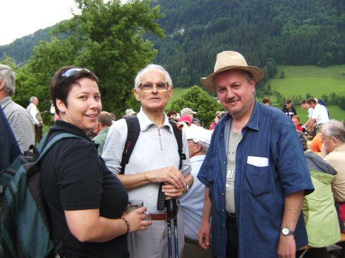 ![]() Auch einige Bewohner der Pension "Zur Waldquelle" (Blindenheim St. Georgen/Reith) nahmen am Wandertag teil. Blindenheim-Leiterin Andrea Diwald mit einem Bewohner und Bgm. Andreas Rautter. |