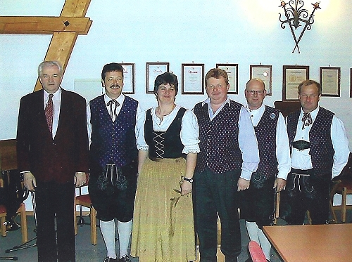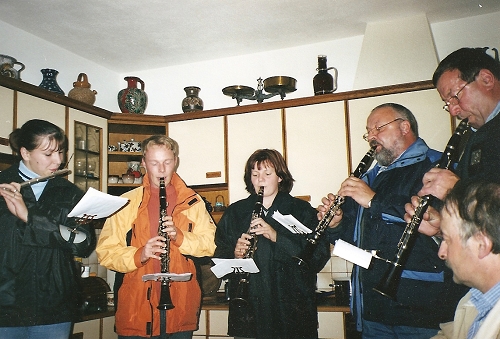 ![]() Um sich eine neue Tracht anschaffen zu können, spielen die Musiker in St. Georgen in kleinen Gruppen von Haus zu Haus und bitten um eine kleine Spende. Musikgruppe Klarinetten und Querflöte, v.l.: Irene Danner, Christian Hauß, Julia Käfer, Hubert Dippelreither, Friedrich Teufel |