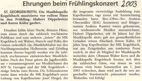 ![]() Ehrungen beim Frühjahrskonzert 2003: Hubert Dippelreither schied nach 46 Jahren als aktiver Musiker aus gesundheitlichen Gründen aus der Kapelle aus. |
