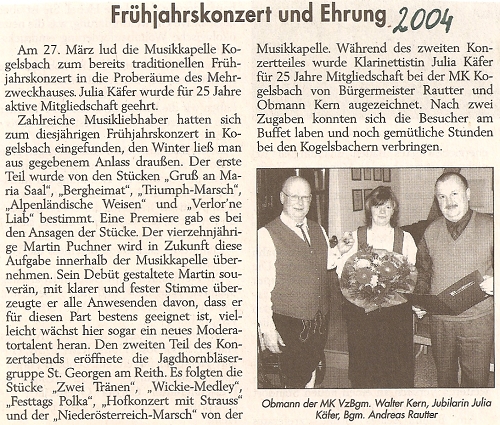 ![]() Original-Zeitungsausschnitt zum Frühjahrskonzert. Julia Käfer wurde für 25 Jahre aktive Musikerin geehrt. |