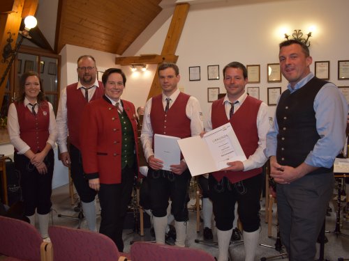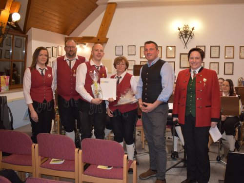 Beim diesjährigen Konzert übernahm Bezirkskassierin Sabine Brandner die Ehrungen. Thomas und Martin Käfer erhielten die Ehrenmedaille in Silber für 25 Jahre aktiver Musiker. |