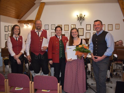 Andres Kern und Julia Käfer erhielten das Ehrenzeichen in Silber für besondere Verdienste um die Blasmusik. Auch seitens der Blasmusik gab es eine Anerkennung: eine Metallfigur und Gutscheine. |
